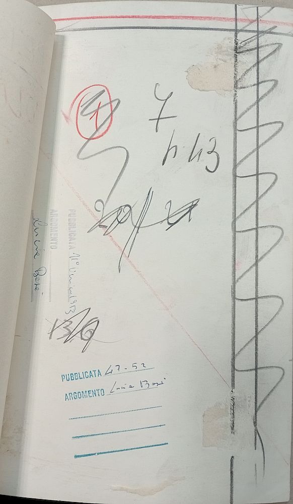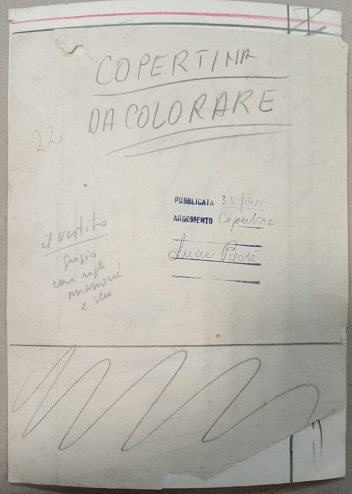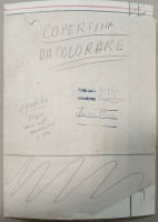 Oprócz tego doklejono kartkę napisem: Copertina da colorare, datą publikacji 35/1955, zaznaczonym ołówkiem formatem i notatką ołówkiem po włosku.