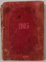 Twarda oprawa, karton oklejony zamszem, z tłoczeniami, datowana 1905, str. 224, luzem dołożony kartonik z dedykacją, format 17,2 x 13 cm