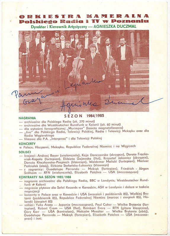 Odręczna dedykacja długopisem(o treści: Panu Gracjanowi Lepianko Agnieszka Duczmal) na okładce programu Orkiestry Kameralnej Polskiego Radia i TV w Poznaniu za sezon 1984/1985 , która to kierowała A.D.