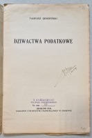 Tadeusz Grodyński, Dziwactwa Podatkowe, Kraków, 1934, z serii Wydawnictwa Towarzystwa Ekonomicznego w Krakowie, Tom 67., Nakładem Towarzystwa Ekonomicznego w Krakowie, Odbito w Drukarni „Czasu” w Krakowie, pod zarządem L. Wójcika. Broszurowa okładka, str. 22[2], format 24,1 x 16 cm.
